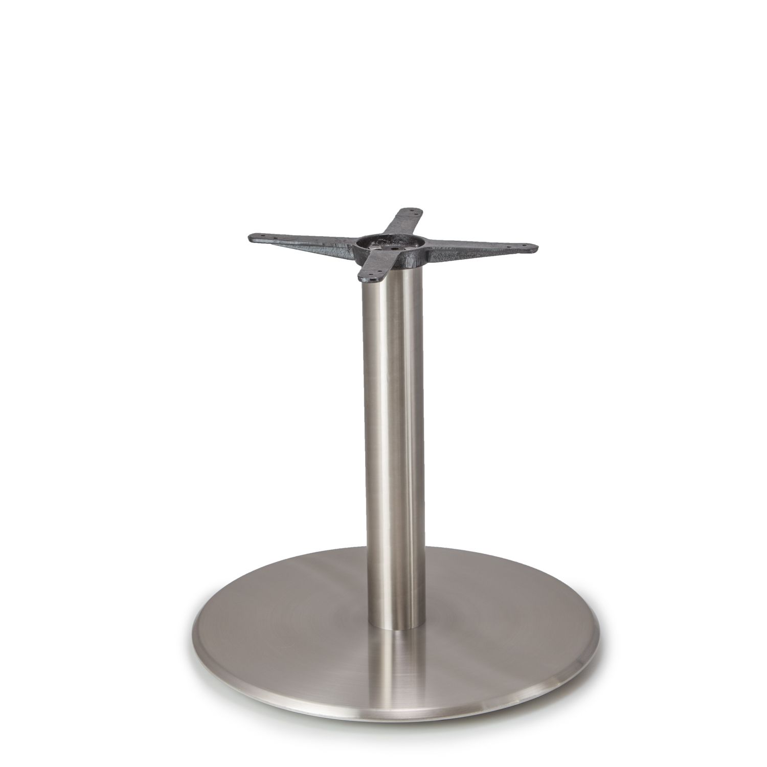 The Argent-28 Satin Chrome Table Base Features: - 28" Cast Iron Base Plate with Chamfered Edge Satin Chrome Cover - 19" Cast Iron Mounting Plate - Available in Custom Heights - Suitable for Tables up to 54" in Diameter - Satin Chrome Finish - Argent-28 bases MUST SHIP ON A PALLET.