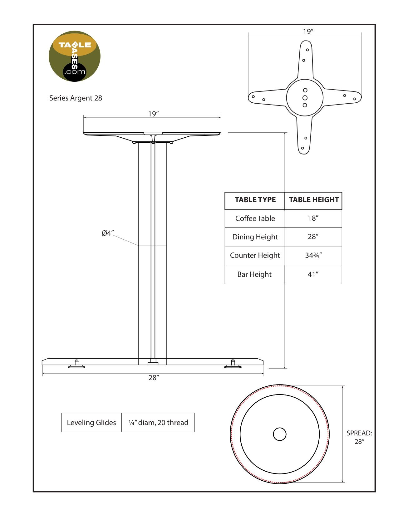 The Argent series bases feature a beautiful satin chrome finish that that resists corrosion. The sleek finish and low profile baseplate blend seamlessly in any, café, diner, bar, pub or restaurant dining areas, while offering a modern look and feel. This table base features a 19" cast iron mounting plate with a 4" diameter steel column finished in satin chrome, and is assembled with two rods for extra strength. With four different heights available, Coffee table height, Dining height, Counter height and Bar height, the table base has the versatility to support your various needs. The Argent series can also be custom cut to any height under 41". The table base has a base spread of 28", weighs in at 70 pounds, and is compatible with square tops up to 48"x48" in size, and round tops up to 54".