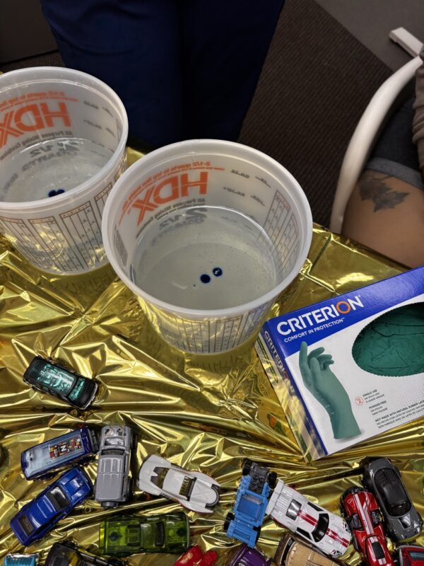 We used a thick pour, two part epoxy resin that is made for doing larger projects. We also decided to add a small amount of blue color to the resin, rather than leave it clear. Resin can yellow over time (especially apparent with clear resins), so we hoped that the blue would offset that yellow aging. We had to pour a thin layer of resin and let it cure in the mold. That way there was a solid platform underneath the cars, which prevented them from sinking down to the bottom (we didn't want any wheels poking through). After that, we poured another thin layer of resin, and before it hardened, we arranged all the cars in the still wet resin (this is the sped up part of our video, it took quite a while to arrange them).