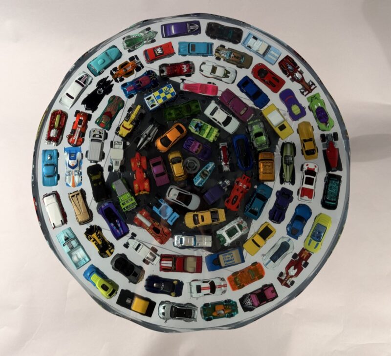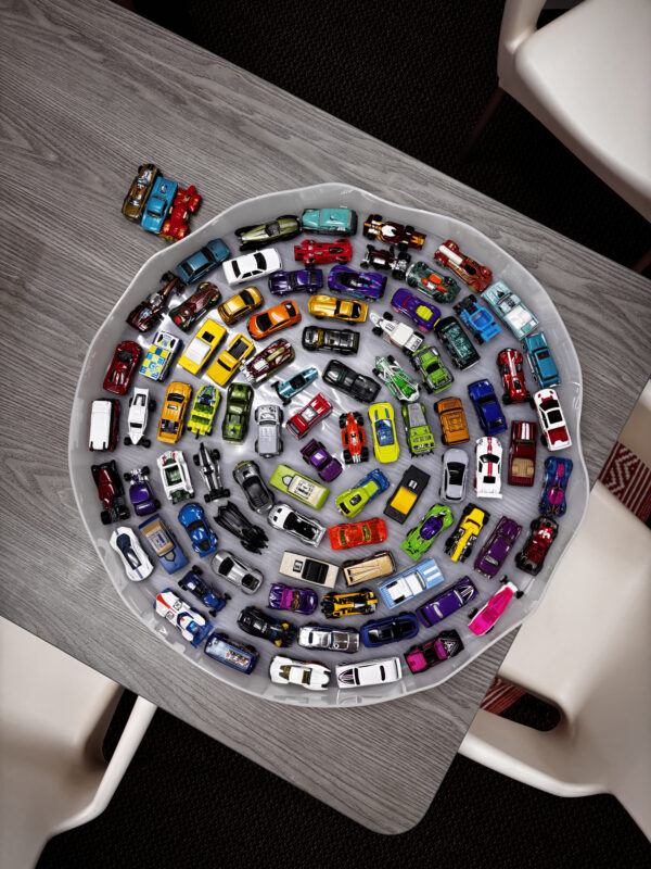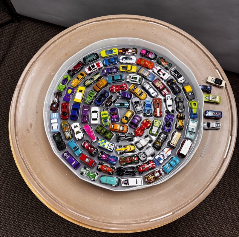 We started in a place that so many kids dream about, the toy aisle. We picked through half a dozen stores, buying as many toy cars as we could without duplicating any models. We ended up with about 100 little toy cars ready to arrange in our 24" round silicone mold.