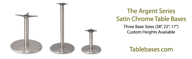Our new Argent Series Satin Chrome table bases are an excellent choice for indoor use in homes and commercial environments. The beautiful finish provides a look that is similar to stainless steel, at a lower cost. The Argent series is available in three different base sizes, 17", 22" and 28" to support tables from up to 54". The Argent series is available at 4 standard heights, and can be custom cut to any height you need, up to 41" tall. While these bases may be suitable for heavy table tops, such as those made from stone, we recommend you call and consult with one of our customer service agents to ensure you'll have a steady and properly supported table. The Argent series is not rated for outdoor use.