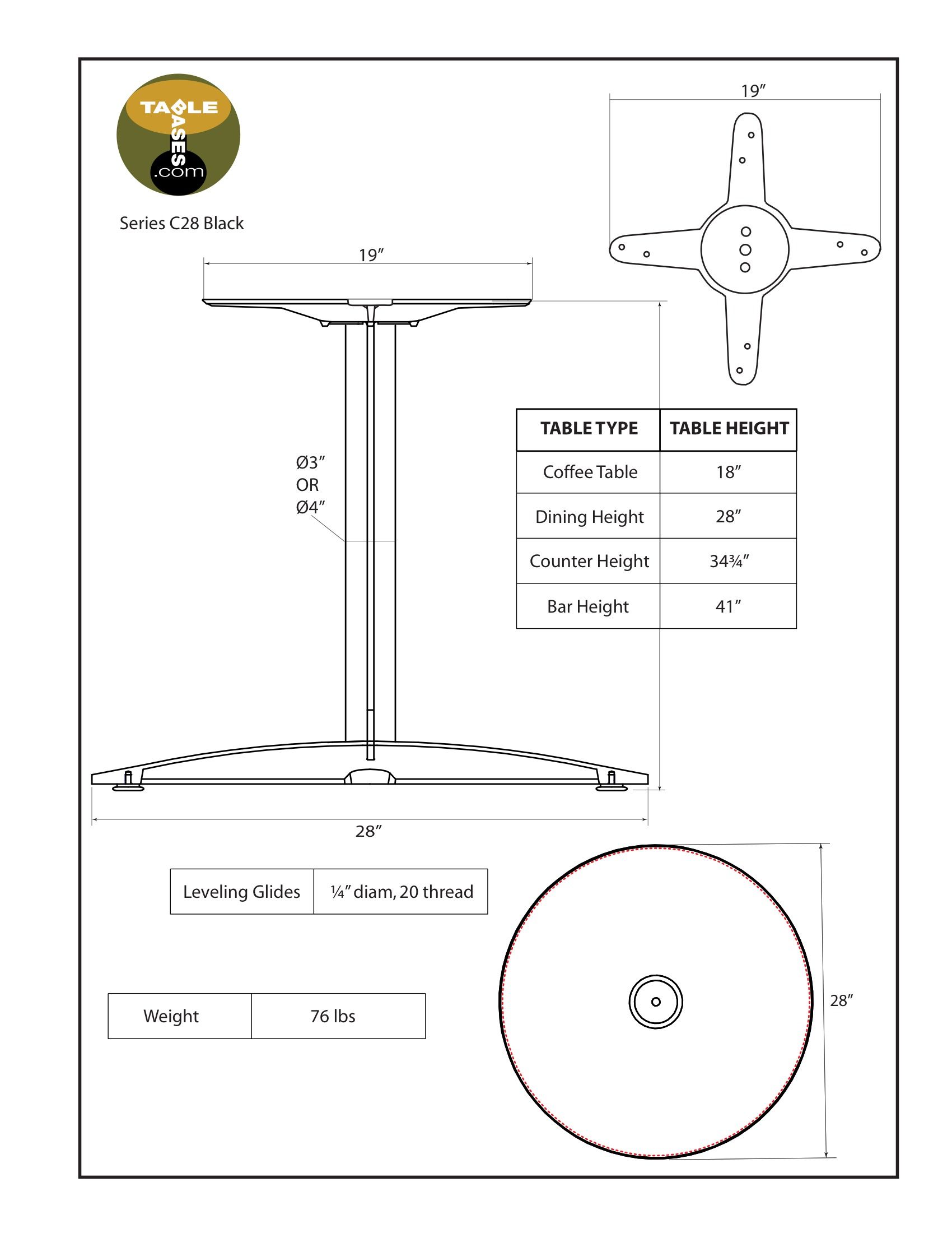 The C28 Black Table Base Features: -19" Cast Iron Mounting Plate -28" Diameter Cast Iron Base Bottom -3” or 4” Diameter, 16 Gauge Steel Column -Supports Tables up to 48” -Textured Black Powder Coat Finish -Custom Heights Available (Please Call) -Compatible with FR19 (3” Column) & FR22 (4” Column) Footrings (See Accessories)