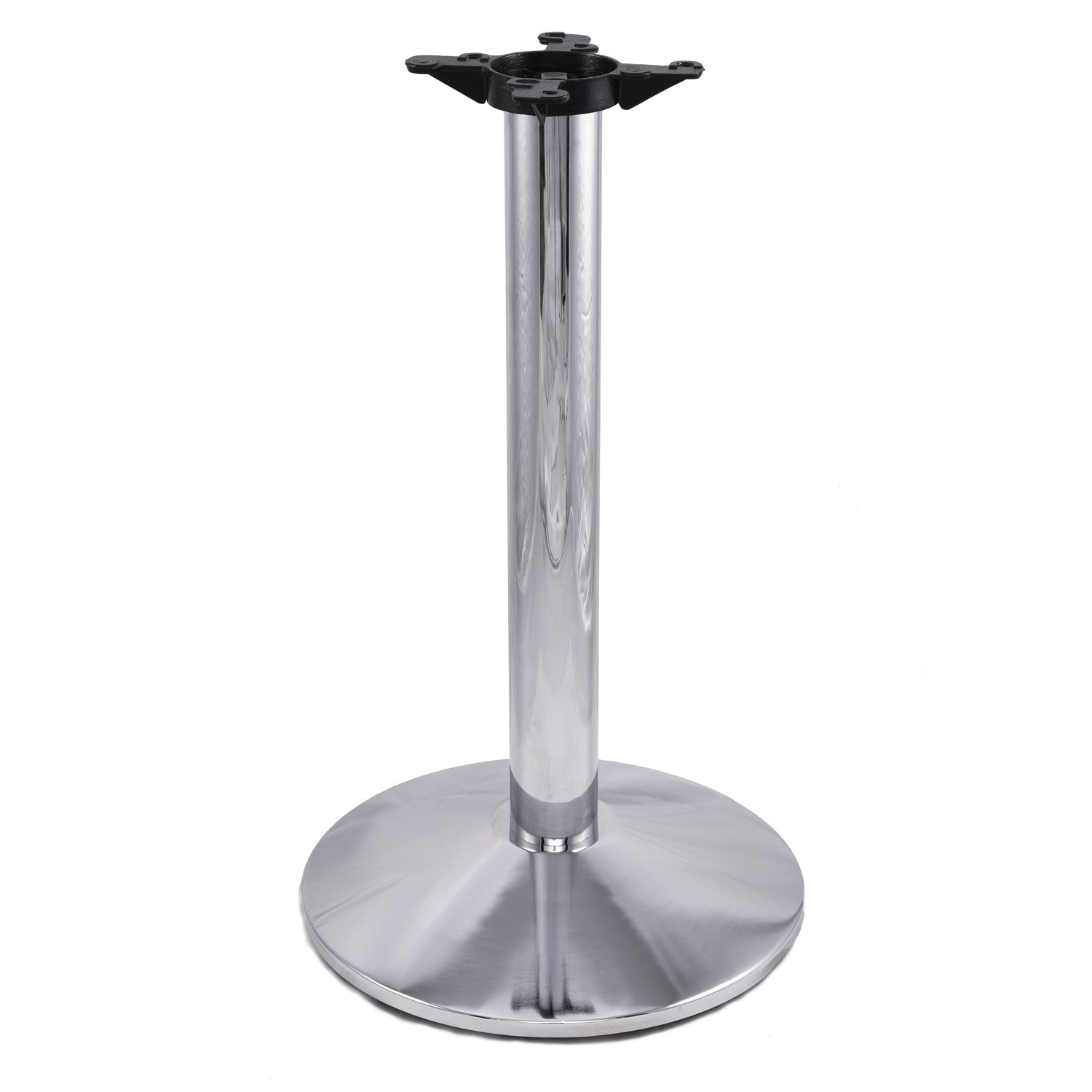 This table base features an 11" cast iron mounting plate with a 3" diameter, 16 gauge steel column. This table base features a commercial grade, polished chrome finish that resists corrosion, and blends seamlessly in any, café, diner, bar, pub or restaurant dining areas, while still offering a modern look and feel. With four different heights available, Coffee table height, Dining height, Counter height or Bar height, this table base has the versatility to support your various needs. The table base has a base spread of 17", weighs in at 34 pounds, and is compatible with round table tops up to 32" in diameter, and square table tops up to 30" x 30".