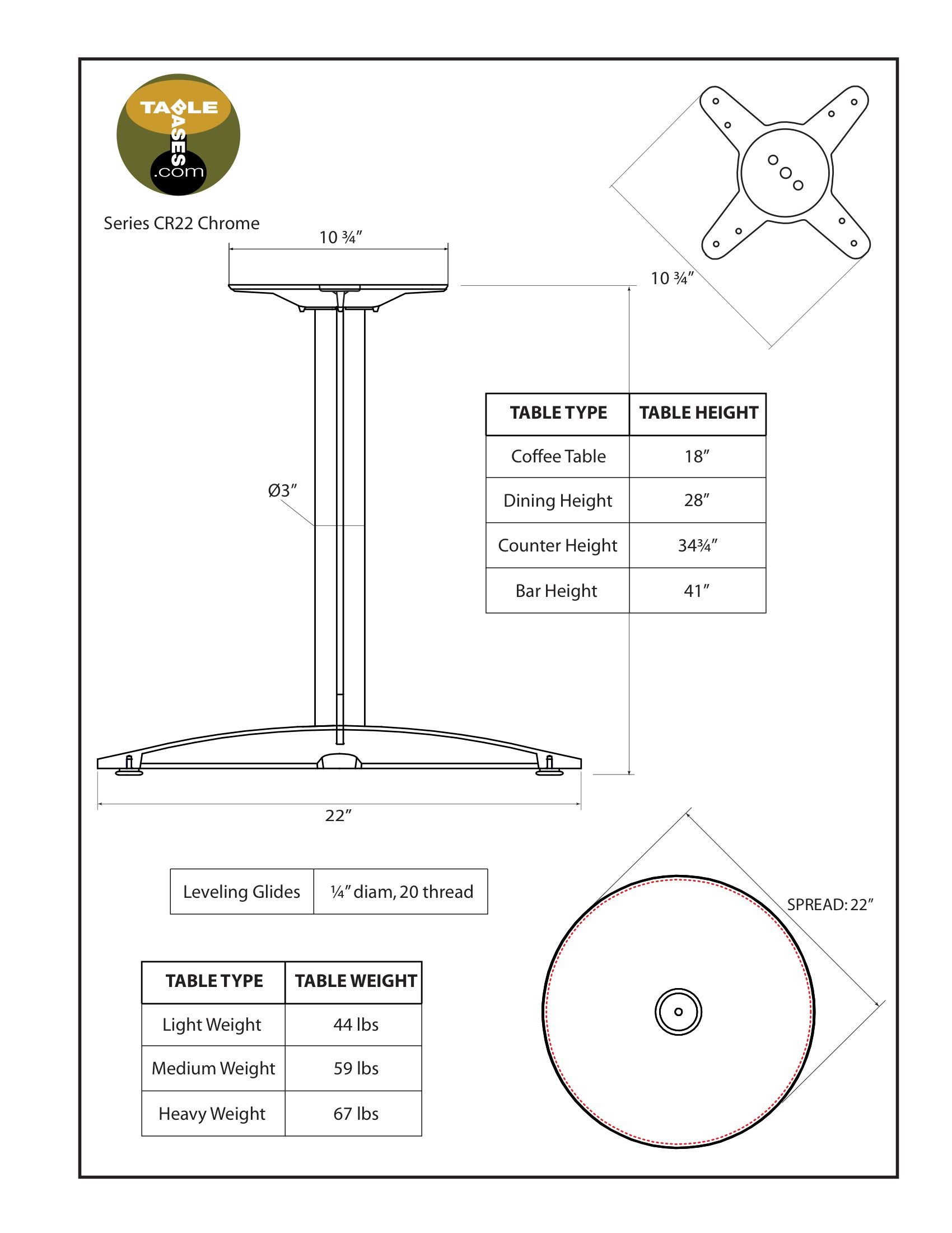 The CR22 Chrome Extra Heavy Weight table base features: -11" Cast iron mounting plate -22" Cast iron base with chrome cover -Polished chrome finish -Supports round tables up to 42" in diameter -Supports square tables up to 42" x 42" -Custom heights available (Please call) -Compatible with FR19 & FR22 Foot Rings (See Accessories)