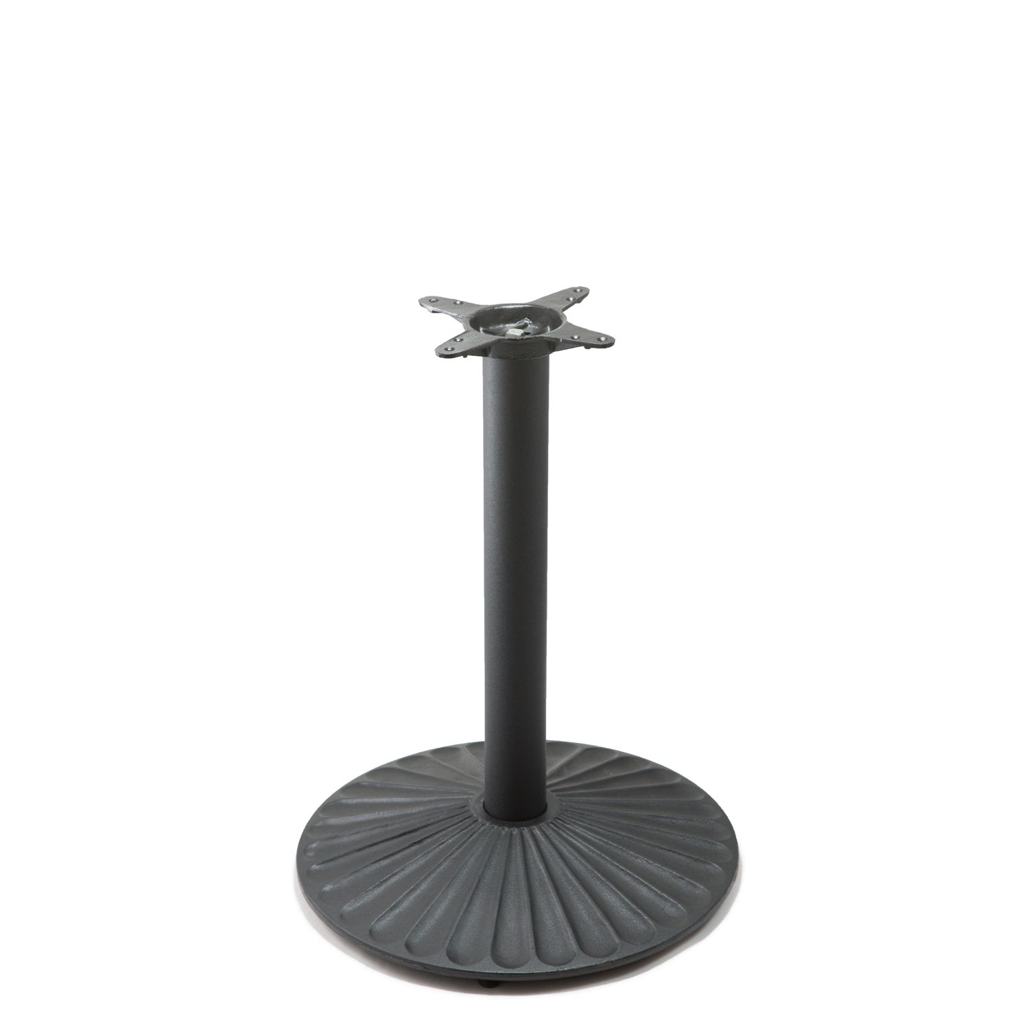 With a patterned cast iron base, the D22 table base adds a bit of flair without distracting from your restaurant décor. This table base features an 11", cast iron mounting plate with a 3" diameter steel column, finished in commercial grade black powder coat that resists corrosion and blends seamlessly in any cafe, diner, bar, pub or restaurant dining areas. The D22 pictured here has been cut to dining height (28"). The table base has a spread of 22" at the floor, and a weight of up to 45 pounds to provide support for rectangular table tops up to 30"x36", square tops up to 32", and round tops up to 42" in size.