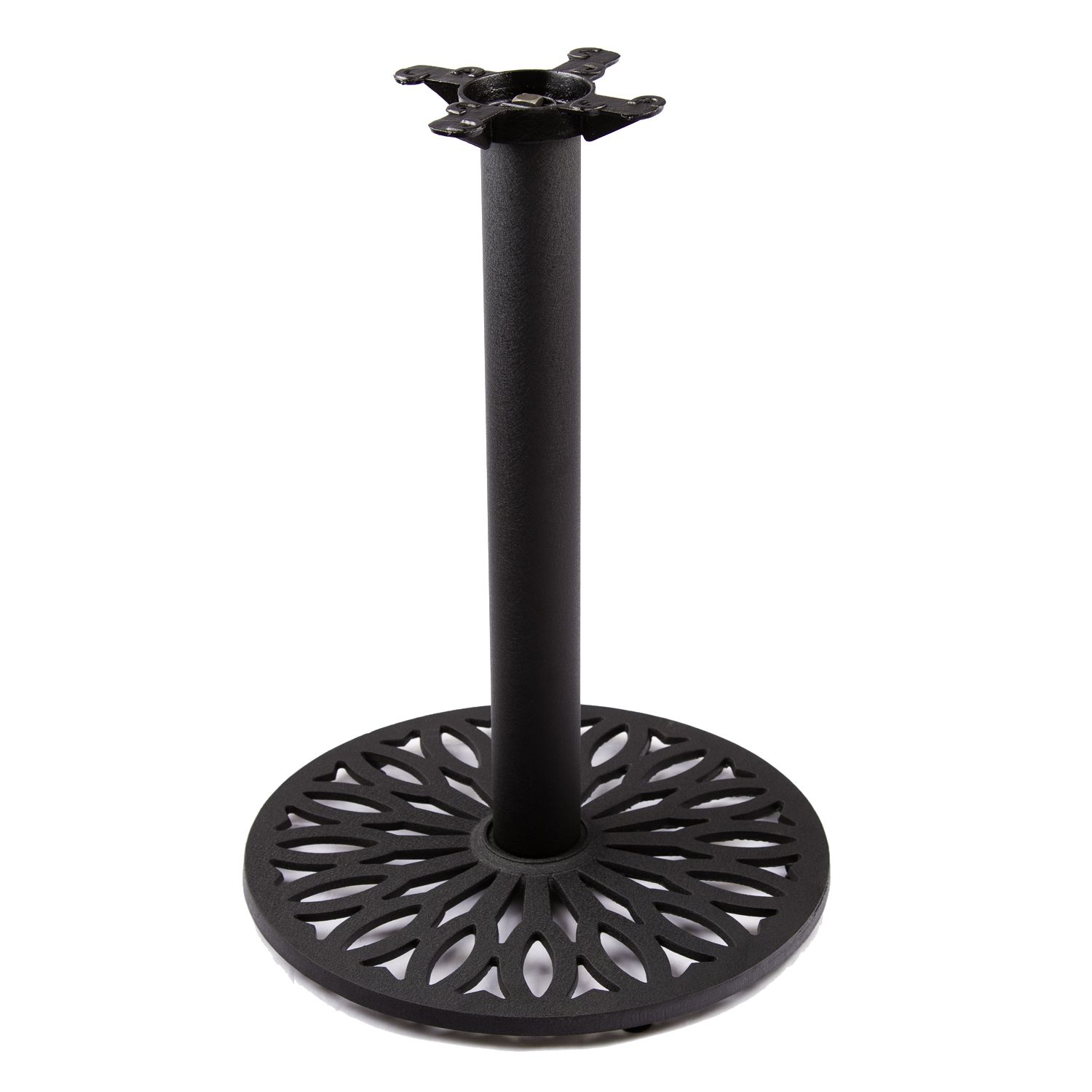 With a pattern cut cast iron base, the E20 table base adds a bit of flair without distracting from your restaurant décor. This table base features a 11", cast iron mounting plate with a 3" diameter steel column, finished in commercial grade black powder coat finish that resists corrosion and blends seamlessly in any cafe, diner, bar, pub or restaurant dining areas. With four different heights available, Coffee table height, Dining height, Counter height or Bar height, this table base has the versatility to support your various needs. The E series table bases can also be cut to custom heights (call to order). The table base has a spread of 20" at the floor, and weighs about 35 pounds. The E20 Black Table base supports square table tops up to 30"x30", and round tops up to 32" in size.