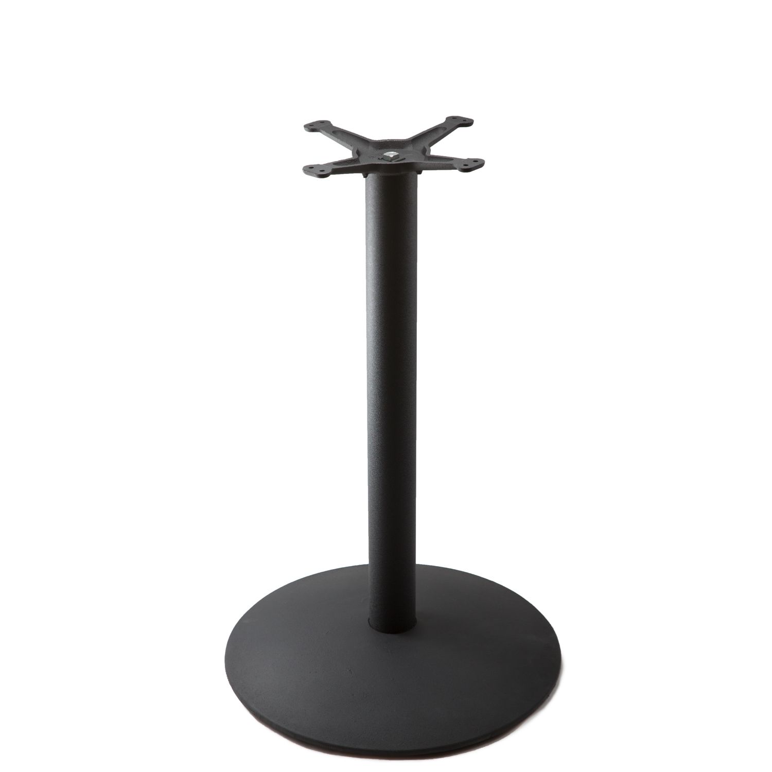 This table base features a 13" cast iron mounting plate with a 3" diameter steel column. This table base features a commercial grade black powder coat finish that resists corrosion, and blends seamlessly in any, café, diner, bar, pub or restaurant dining areas. The table base pictured here is cut to counter height (34 3/4"). The table base has a base spread of 22", weighs in at 38 pounds, and is compatible with square or round tops up to 36" in size.