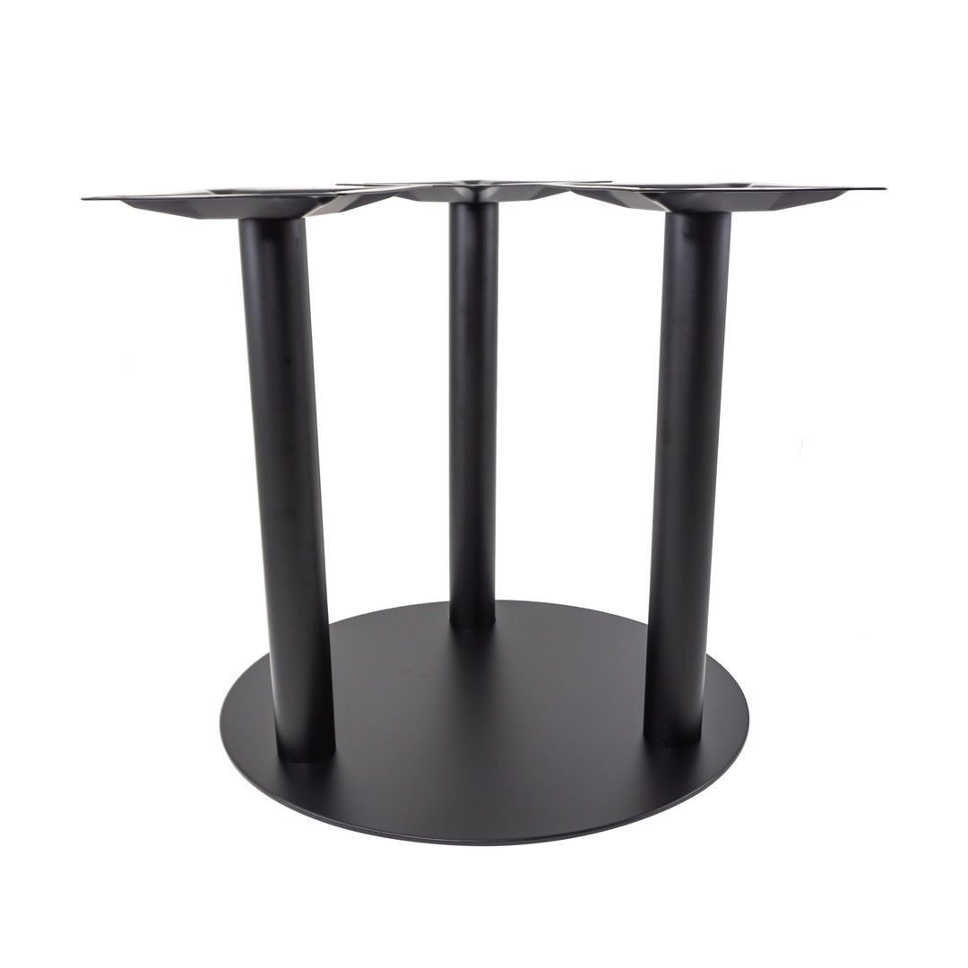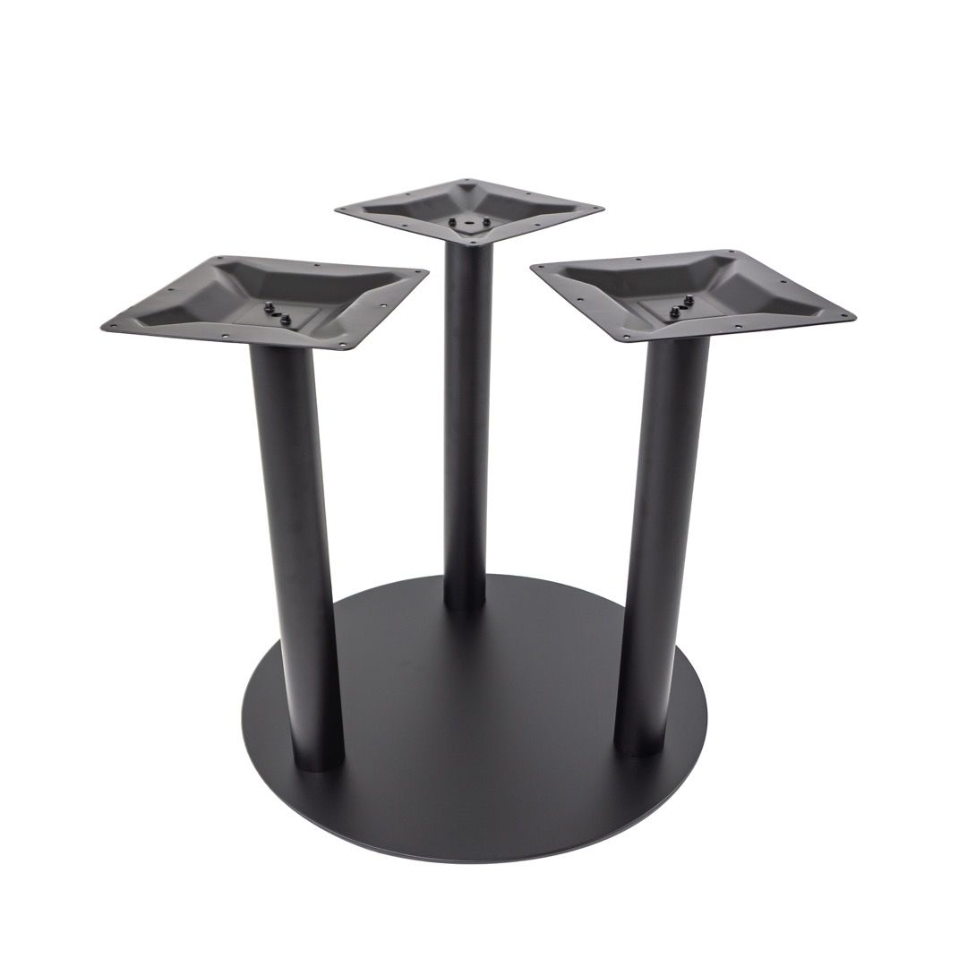 This table base features a tri-column design with three 12" x 12" steel mounting plates and three, 3" diameter, 16 gauge steel columns. The commercial grade, black satin powder coat finish has a smooth finish and light sheen. Combined with the zinc coating, the Ravello line is very corrosion resistant, making them a great table choice for an outdoor table base. These bases are also available with optional stainless steel assembly hardware, for added corrosion resistance. The Ravello line is available at Dining Height and Bar Height. Tablebases.com can also cut these table bases to custom heights (please call to order).